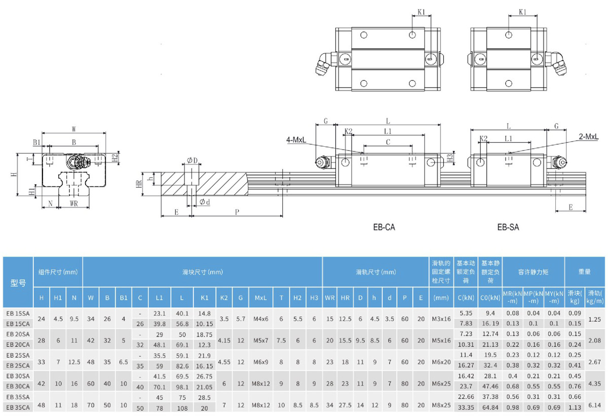 EB series use four rows of steel balls to bear the load design, so that it has high rigidity, high load characteristics, while having four directions and other load characteristics, and automatic centering function, can absorb the assembly error of the mounting surface, to get the high precision requirements; plus reduce the combination of height and shorten the length of the slider, very suitable for high-speed automated industrial machinery and space requirements of small equipment use. The slider is equipped with a ball retainer to prevent the ball from falling off, this design is not only convenient for customers to install the linear guide, when the slider is removed there will be no ball falling off, and the interchangeability is allowed under the accuracy.
